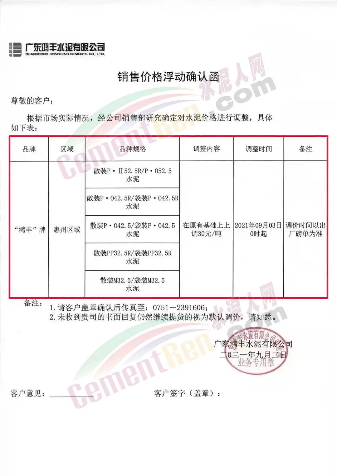 廣東鴻豐水泥有限公司通知,自2021年9月3日起,公司惠州區(qū)域“鴻豐”牌水泥各標(biāo)號(hào)上調(diào)30元/噸。