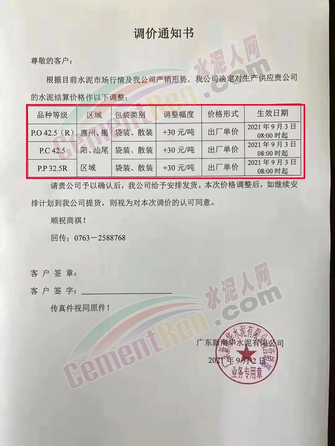 河源市金杰環(huán)保建材有限公司通知,根據(jù)當(dāng)前市場(chǎng)情況,經(jīng)公司研究決定自 2021年9月2日下午17時(shí)起全區(qū)域全品種水泥在原價(jià)格基礎(chǔ)上上調(diào)10元/噸。