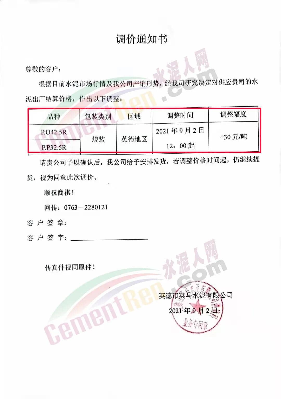 由于受各種原材料價(jià)格上升的影響,公司根據(jù)目前水泥的市場(chǎng)行情,經(jīng)研究決定從2021年9月2日下午18時(shí)起,公司供應(yīng)的PP32.5R包裝、散裝在原價(jià)的基礎(chǔ)上上調(diào)10元/噸。PO42.5R散裝在原價(jià)的基礎(chǔ)上上調(diào)10元/噸。