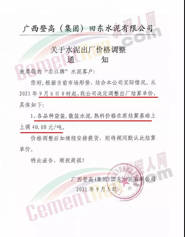 9月5日華潤(rùn)水泥對(duì)發(fā)往南寧北區(qū)域以及平南方向各品種水泥價(jià)格上調(diào)50元/噸。