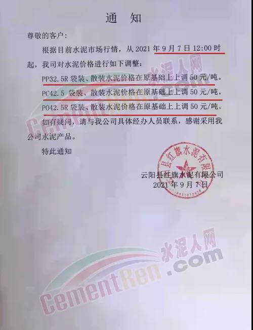 9月5日廣西華宏建材有限公司對(duì)各品種水泥價(jià)格上調(diào)50元/噸。