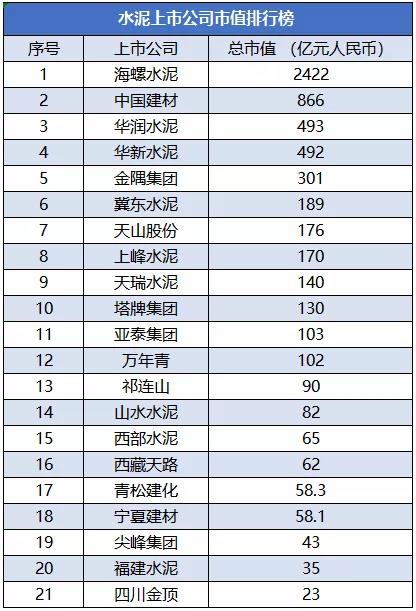 從上述榜單來(lái)看,截至9月6日晚間收盤(pán)時(shí),總市值超過(guò)1000億的水泥企業(yè)只有一家——海螺水泥。而排名前五的水泥企業(yè)分別是:海螺水泥2422億、中國(guó)建材866億、華潤(rùn)水泥493億、華新水泥492億、金隅集團(tuán)401億。
