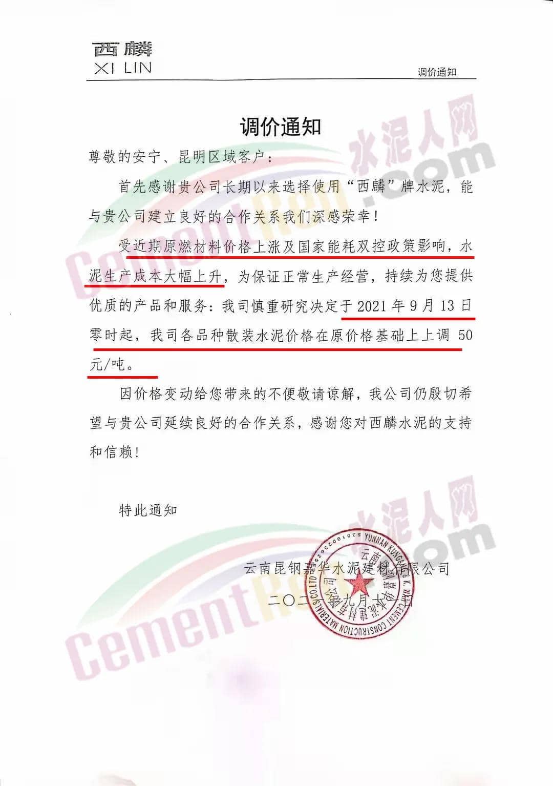 云南昆鋼嘉華水泥建材有限公司通知受近期原燃材料價(jià)格上漲及國家能耗雙控政策影響,水泥生產(chǎn)成本大幅上升,為保證正常生產(chǎn)經(jīng)營,決定于2021年9月13 日零時(shí)起,公司各品種散裝水泥價(jià)格在原價(jià)格基礎(chǔ)上上調(diào)50元/噸。