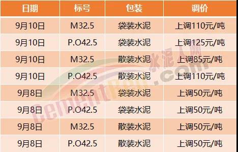 9月7日重慶綦江西南水泥、長壽西南水泥、臺(tái)泥重慶公司等9家企業(yè)通知由于原材料成本增加,所有區(qū)域所有品牌水泥價(jià)格在原執(zhí)行價(jià)格基礎(chǔ)上上調(diào)50元/噸。