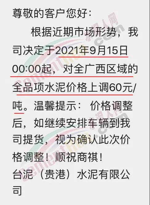 廣西港泥通知,自9月15日起對廣西區(qū)域各品種水泥上調(diào)60元/噸。