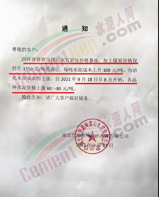 湖北世紀(jì)新峰雷山水泥通知自9月18日起上調(diào)各品種水泥價格60-80元/噸。