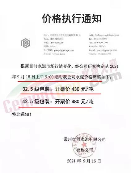 江蘇常州盤固水泥有限公司銷售公司通知,9月15日上午9時對公司水泥價格進(jìn)行調(diào)整,調(diào)整后42.5包裝開票價480元/噸。