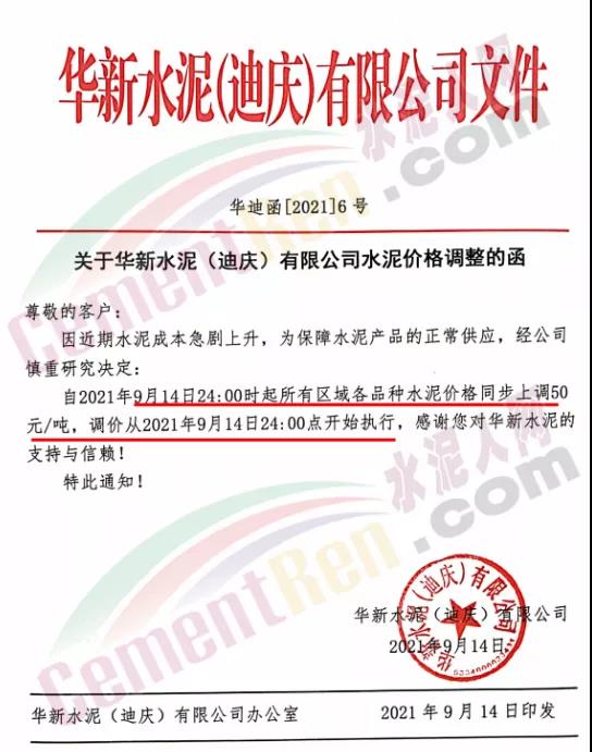 華新水泥(迪慶)有限公司通知,9月14日24時所有區(qū)域各品種水泥價格同步上調(diào)50元/噸。