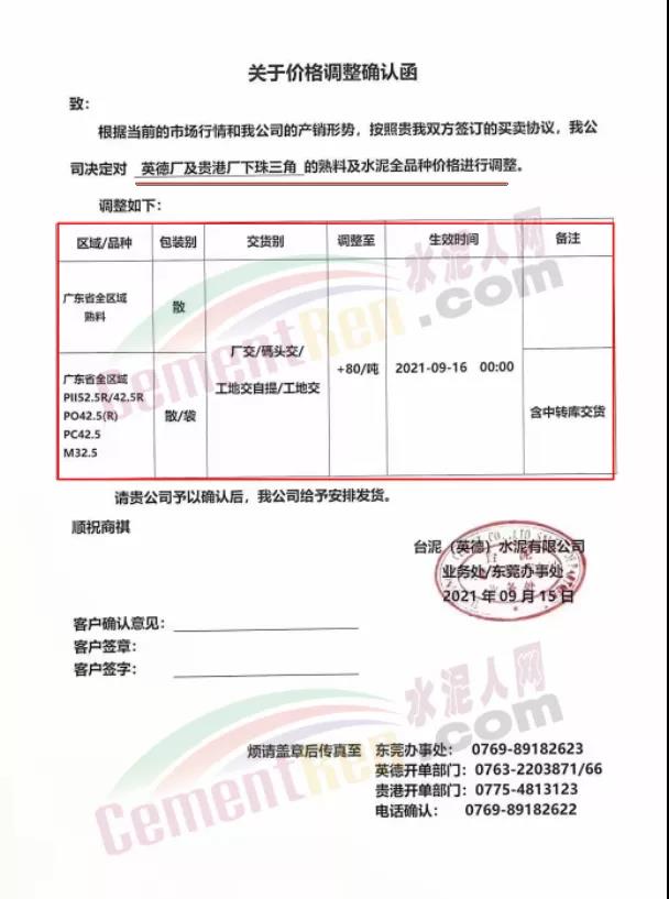 臺泥(英德)水泥有限公司通知,自9月16日0時起,英德廠及貴港廠下珠三角的熟料及水泥全品種價格上調(diào)80元/噸。
