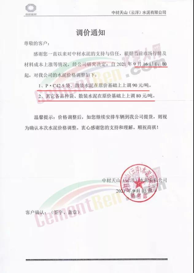 中材亨達(dá)水泥有限公司通知,9月16日0時起P.C42.5袋、散裝水泥上調(diào)90元/噸。其他各品種袋裝、散裝水泥上調(diào)80元/噸。