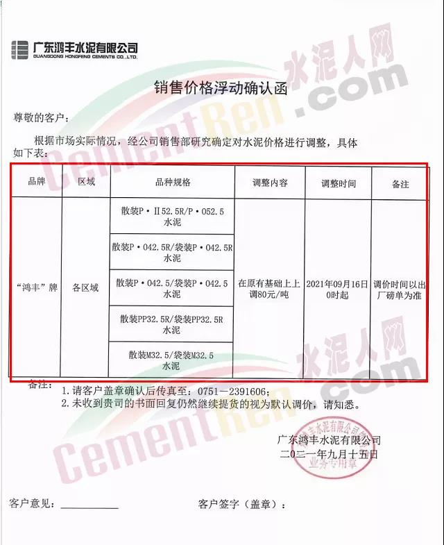 廣東鴻豐水泥有限公司通知各標(biāo)號水泥上調(diào)80元/噸。