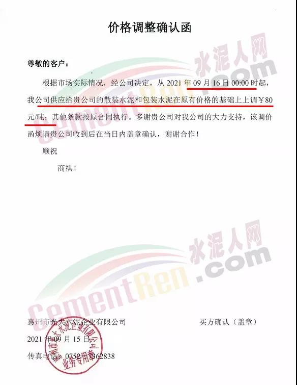 惠州光大水泥通知,9月16日0時起,水泥價格上調(diào)80元/噸。