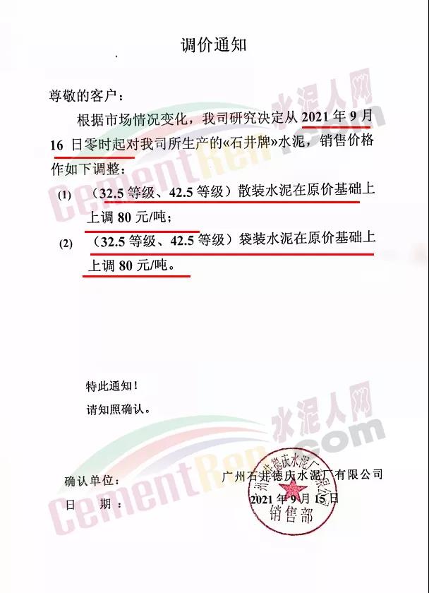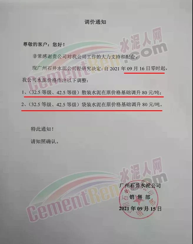 廣州石井水泥公司通知,9月16日0時起,各標(biāo)號水泥上調(diào)80元/噸。