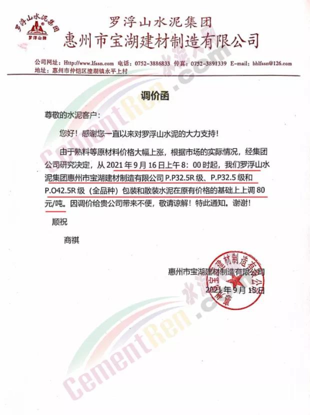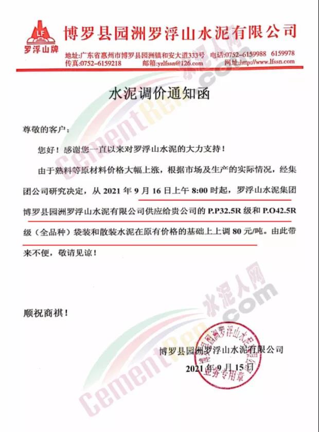 博羅縣園洲羅浮山水泥有限公司通知,9月16日上午8時起各標(biāo)號水泥上調(diào)80元/噸。