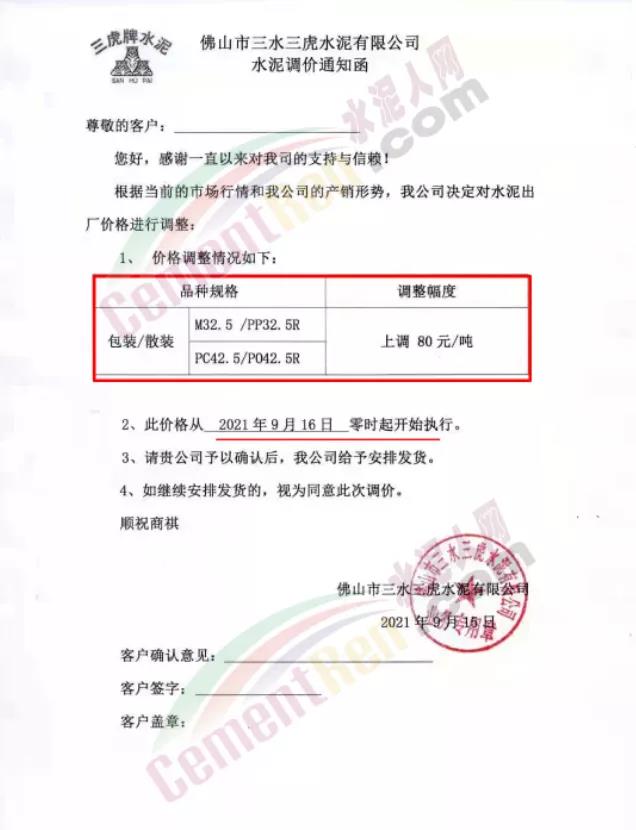 佛山市 三水三虎水泥通知9月16日起上調(diào)各標(biāo)號水泥80元/噸。