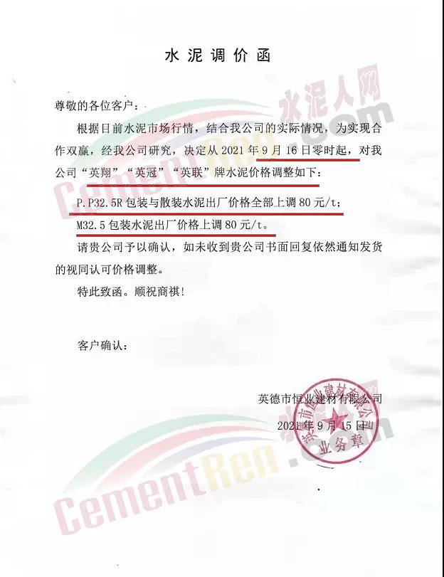 英德市恒業(yè)建材有限公司通知9月16日零時起,公司各標(biāo)號水泥上調(diào)80元/噸。