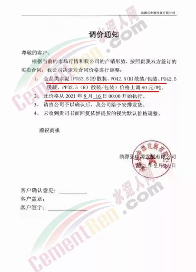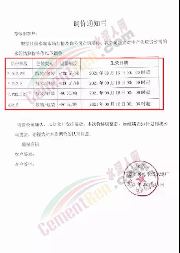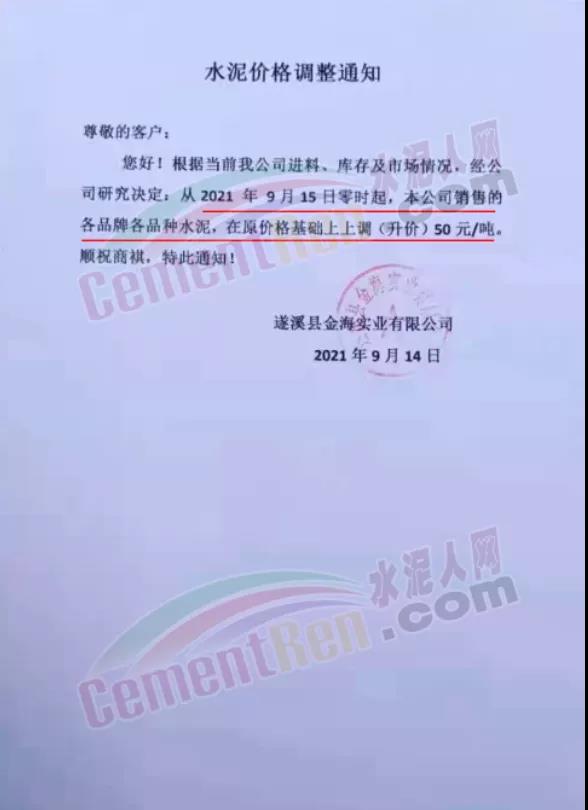 華潤水泥平南銷售區(qū)域通知,根據(jù)近期市場形勢和公司實際生產(chǎn)情況,決定于2021年9月15日12時起,對發(fā)平南區(qū)域袋裝、散裝各品種水泥出廠價格上調(diào)50元/噸。