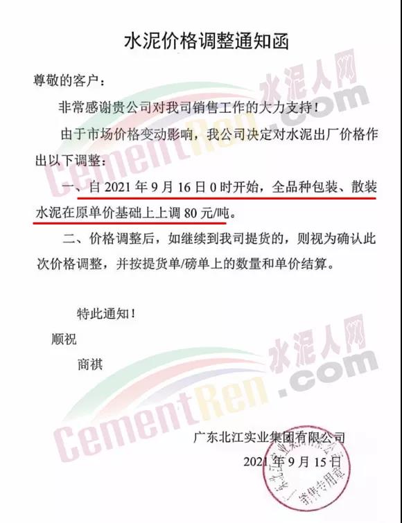 廣東北江實業(yè)集團有限公司通知9月16日0時開始,全品種水泥上調(diào)80元/噸。