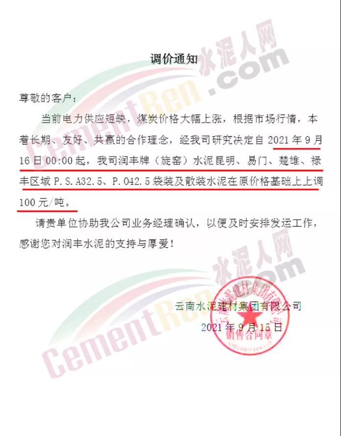 云南水泥建材集團有限公司通知,當(dāng)前電力供應(yīng)短缺,煤炭價格大幅上漲,根據(jù)市場行情,本著長期、友好、共贏的合作理念,經(jīng)公司研究決定自2021年9月 16日0時起,公司潤豐牌(旋窯)水泥昆明、易門、楚雄、祿豐區(qū)域P.S.A32.5、P.042.5袋裝及散裝水泥在原價格基礎(chǔ)上上調(diào)100元/噸。