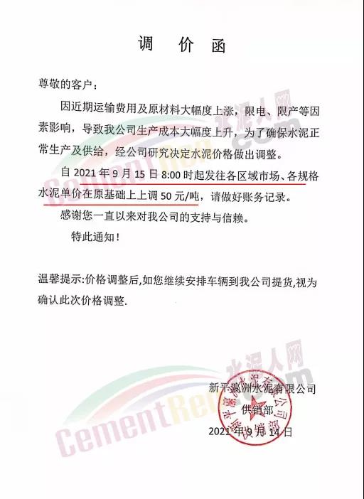 云南省玉溪市新平彝族傣族自治縣新平瀛洲水泥有限公司通知,因近期運輸費用及原材料大幅度上漲,限電、限產(chǎn)等因素影響,導(dǎo)致公司生產(chǎn)成本大幅度上升,為了確保水泥正常生產(chǎn)及供給,經(jīng)公司研究決定水泥價格做出調(diào)整。自2021年9月16日零時起發(fā)往各區(qū)域市場的P.A.S32.5散、袋裝,PO42.5水泥散、袋裝水泥出廠單價在原基礎(chǔ)上上調(diào)60元/噸,PO52.5散裝水泥出廠單價在原基礎(chǔ)上上調(diào)100元/噸,礦粉出廠單價在原價格基礎(chǔ)上上調(diào)20元/噸。