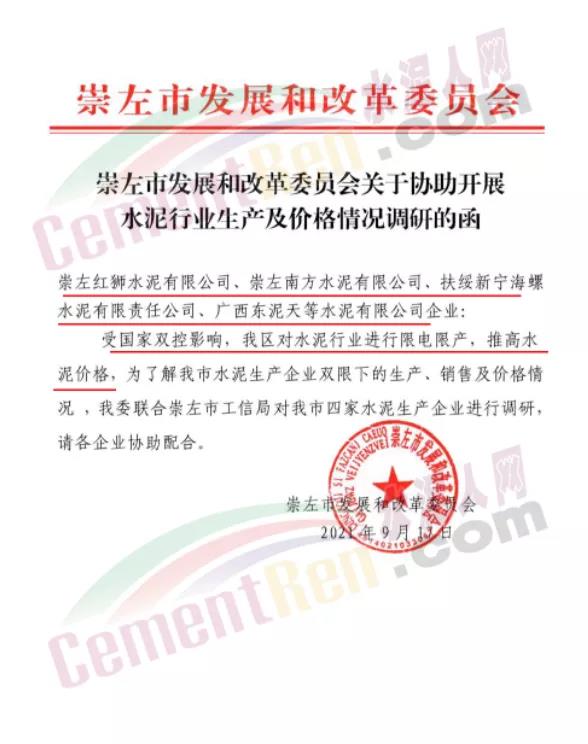 近日,崇左市發(fā)改委發(fā)調(diào)研函給轄區(qū)內(nèi)紅獅、南方、海螺、東泥天等等水泥企業(yè)稱,受國家雙控影響,廣西壯族自治區(qū)對水泥行業(yè)進行限電限產(chǎn),推高水泥價格,為了解崇左市水泥企業(yè)雙限下的生產(chǎn)、銷售及價格情況,崇左市發(fā)改委聯(lián)合崇左市工信局將對區(qū)域內(nèi)四家水泥生產(chǎn)企業(yè)進行調(diào)研。