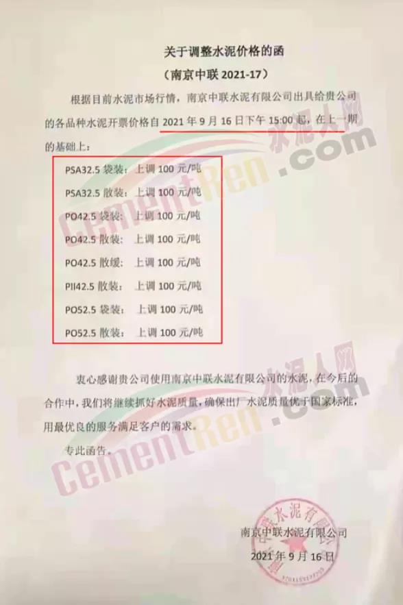 南京中聯(lián)水泥有限公司通知,根據(jù)目前水泥市場行情,自9月16日下午15時起各標(biāo)號水泥上調(diào)100元/噸。