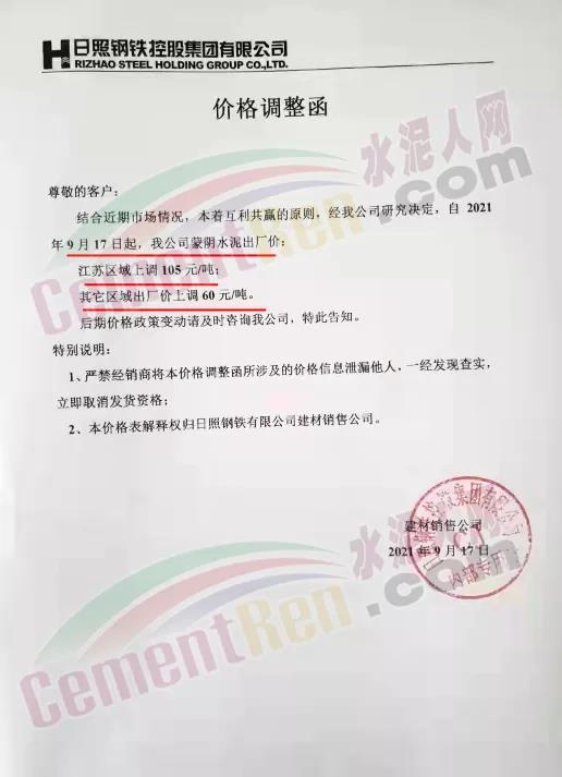 日照鋼鐵控股集團通知,自9月17日起公司蒙陰水泥出廠價,江蘇區(qū)域上調(diào)105元/噸,其他區(qū)域出廠價上調(diào)60元/噸。