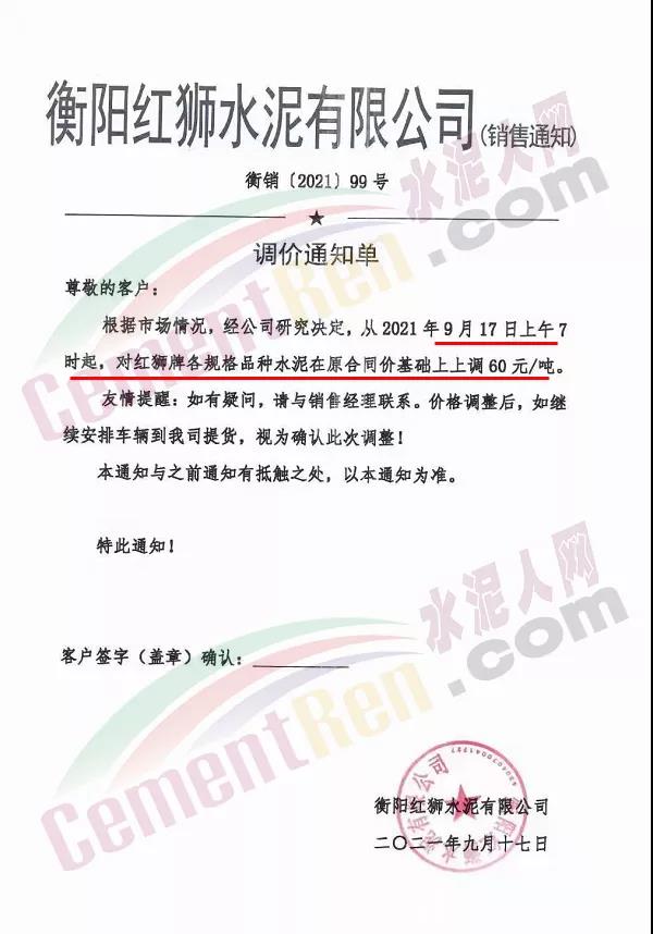 衡陽紅獅水泥通知,自9月17日上午7時起上調(diào)各規(guī)格品種水泥價格60元/噸。