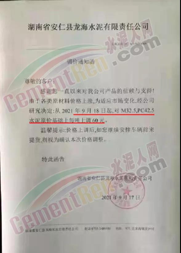 湖南省安仁縣龍海水泥有限責(zé)任公司通知,自9月18日起,上調(diào)水泥價格60元/噸。