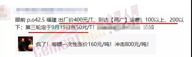 福建地區(qū)經(jīng)銷商通知稱,目前P.O42.5散裝水泥出廠價400元/噸,到達兩廣運費100-200元以下,并預(yù)告稱第三輪漲價定于9月19日漲50元/噸。