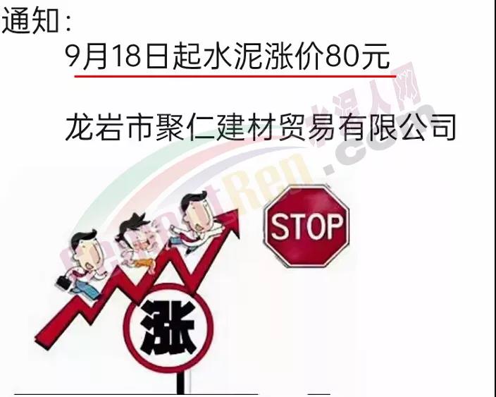 龍巖市聚仁建材貿(mào)易有限公司通知,9月18日起水泥漲價80元/噸。