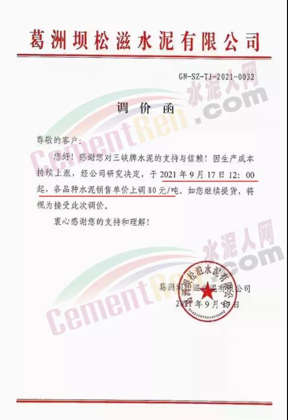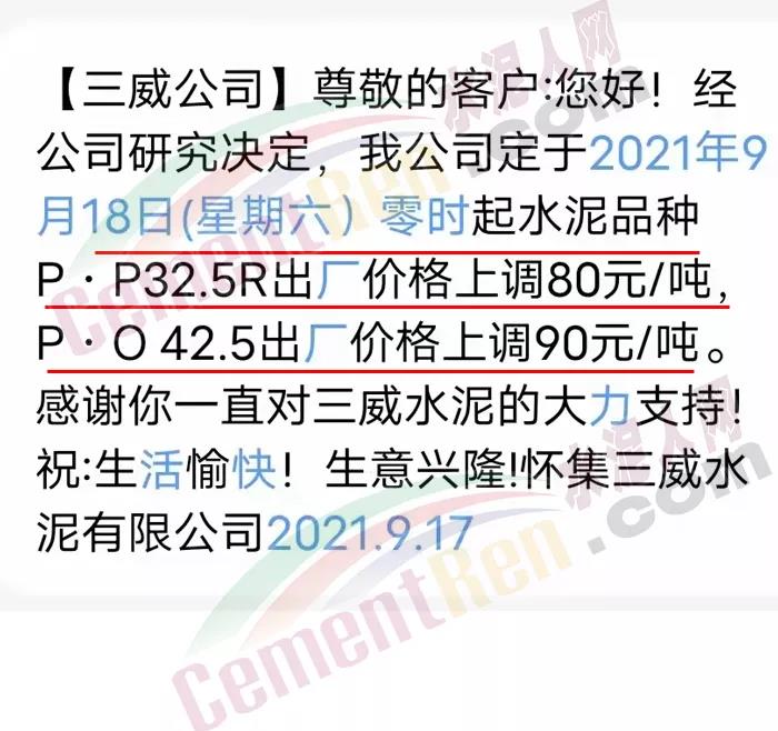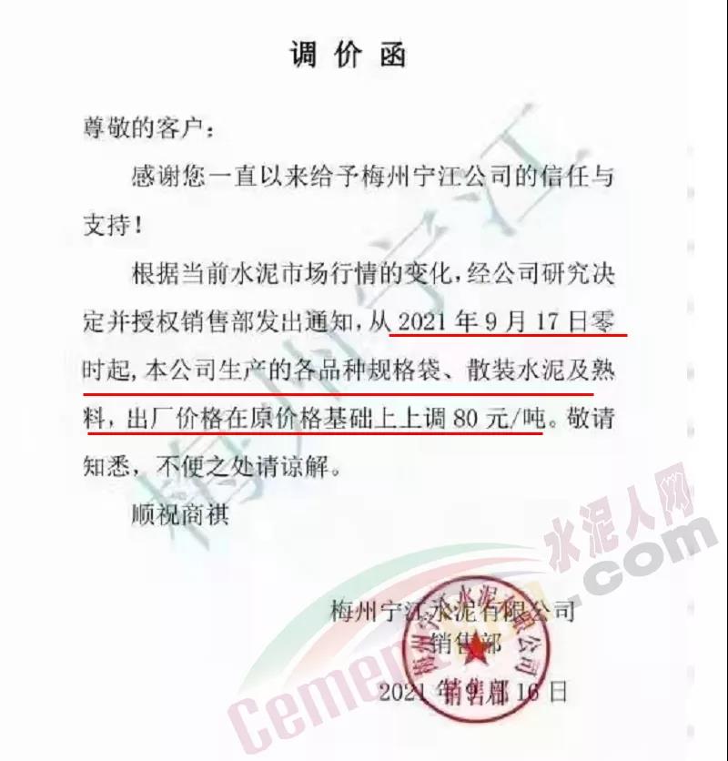 根據(jù)當(dāng)前市場行情,我司決定自2021年9月18日零時起,上調(diào)三明區(qū)域各品種袋、散水泥價格80元/噸。特此通知!