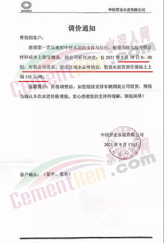 中材羅定水泥有限公司通知,自9月18日0時起,公司茂名、湛江區(qū)域全品種水泥上調(diào)110元/噸。