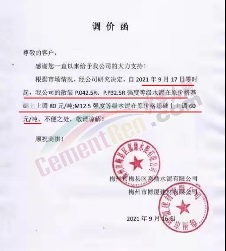 梅州市梅縣區(qū)嘉鼎水泥通知,9月17日起上調(diào)各標(biāo)號水泥80元/噸,M12.5上調(diào)60元/噸。