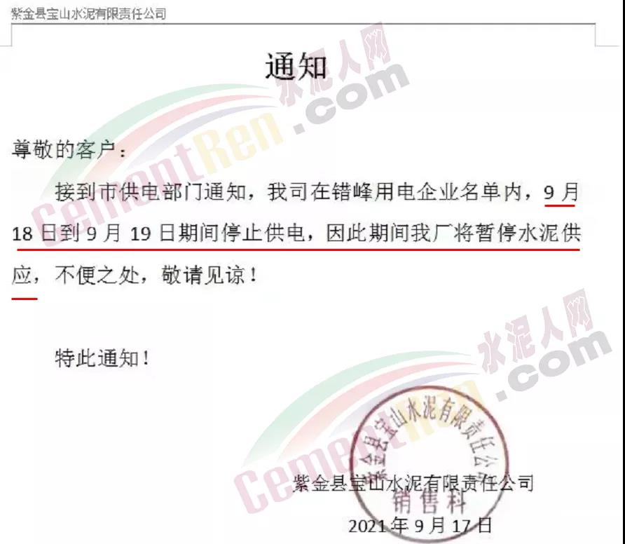 紫金縣寶山水泥有限責(zé)任公司通知,9月18日到9月19日期間停止停電,因此期間工廠將暫停水泥供應(yīng)。