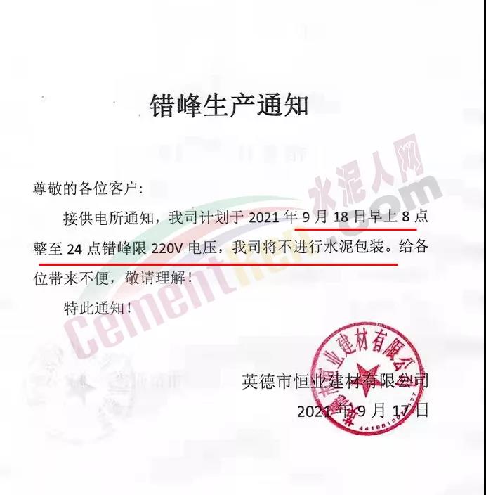 英德市恒業(yè)建材有限公司通知,9月18日早8點至24電錯峰限220V電壓,公司將不進行水泥包裝。