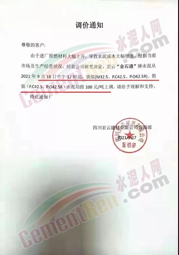 四川宏云建材有限公司通知,自9月18日中午12時起各標(biāo)號水泥上調(diào)100元/噸。