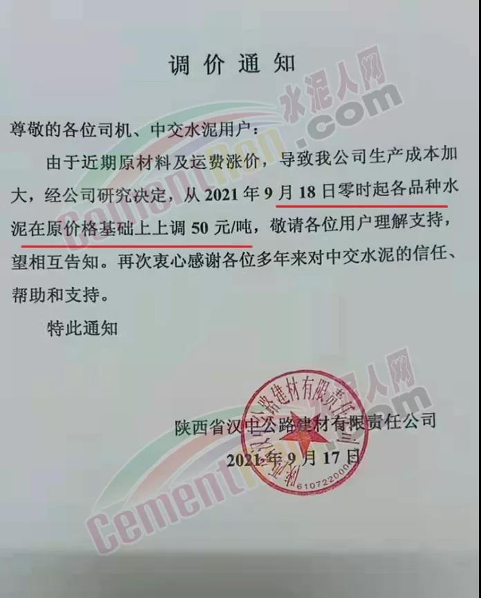 中材漢江水泥通知,自9月17日12時起對漢中各區(qū)域“中材”牌各品種水泥上調(diào)50元/噸。