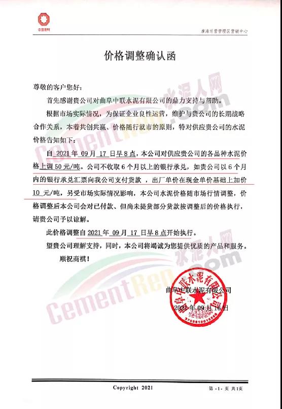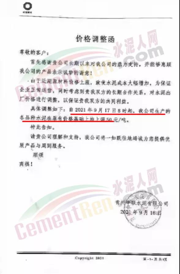 山東山水水泥集團有限公司青島分公司通知由于各類原材料成本大幅度上漲,導(dǎo)致水泥生產(chǎn)成本大幅提高。鑒于以上原因,經(jīng)公司綜合權(quán)衡決定自2021年9月17日上午8時起,公司生產(chǎn)的各品種水泥在原價格基礎(chǔ)上統(tǒng)一上調(diào)50元/噸。