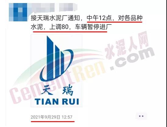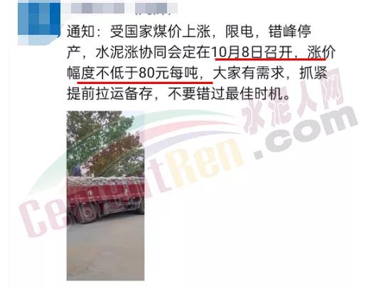 同日有經銷商通知,受國家煤價上漲,限電,錯峰停產,水泥漲協(xié)同會定在10月8日召開,漲價幅度不低于80元/噸,大家有需求,抓緊提前拉運備存,不要錯過最佳時機。