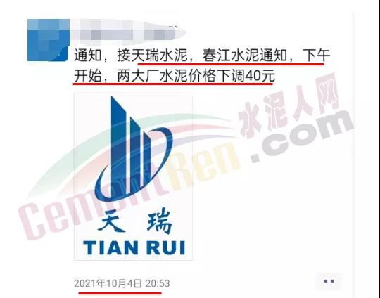 10月4日天瑞水泥、春江水泥等通知下調水泥價格40元/噸。