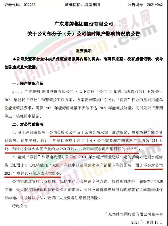 10月11日塔牌集團(tuán)稱,近日,廣東塔牌集團(tuán)股份有限公司知悉當(dāng)?shù)卣块T下發(fā)關(guān)于2021 年能耗“雙控”預(yù)警調(diào)控工作方案,方案要求落實(shí)廣東省內(nèi)“兩高”行業(yè)的重點(diǎn)用能單位能耗調(diào)控要求,確保2021年能源消耗量不突破下達(dá)2021年能耗控制量,同時(shí)采取“開四停三”錯峰用電措施。