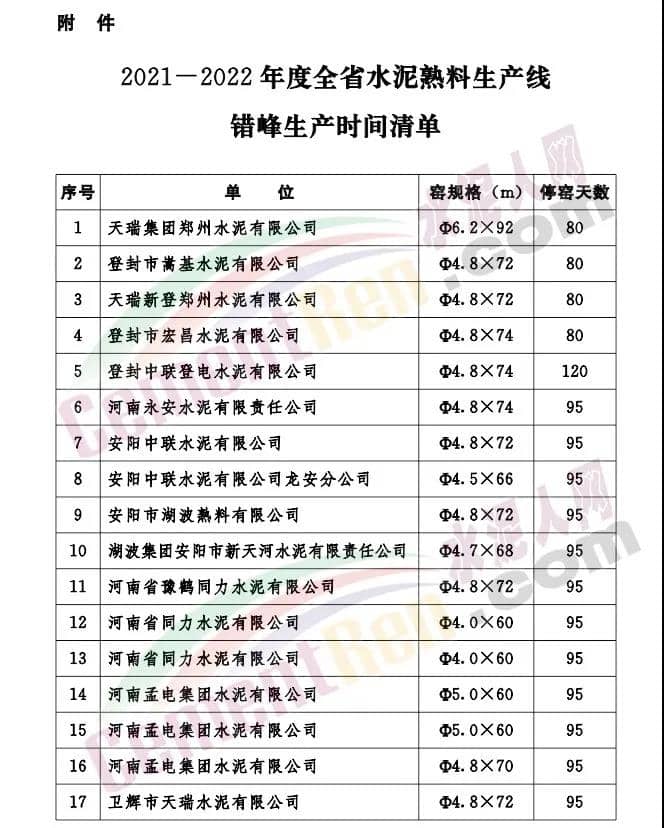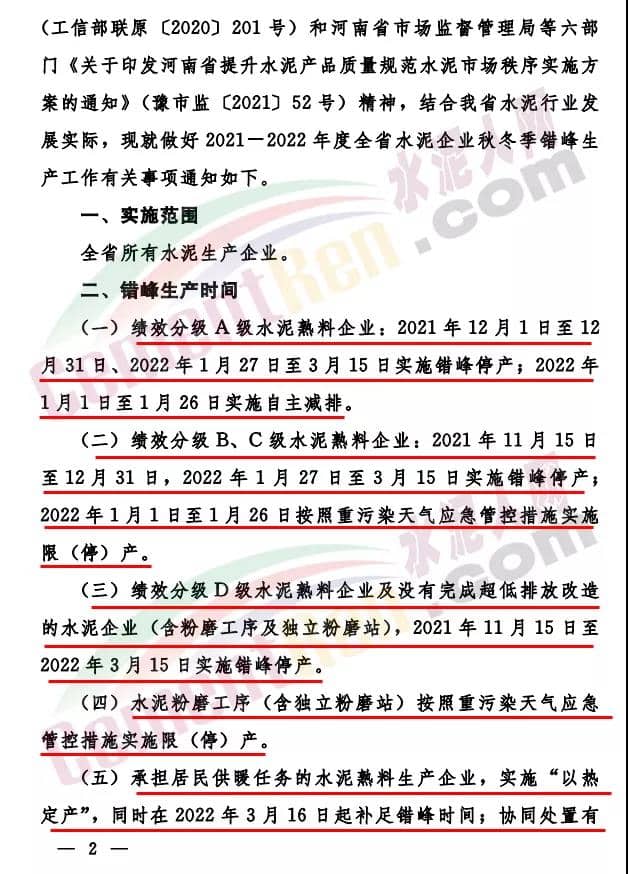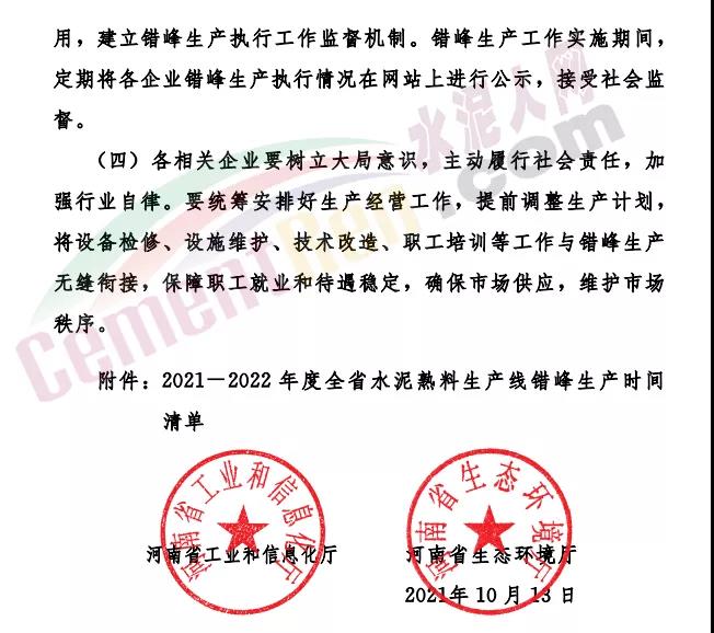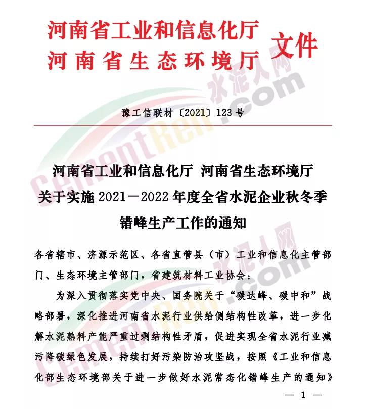 水泥人網(wǎng)通訊員消息,日前,河南河南省工業(yè)和信息化廳聯(lián)合河南省生態(tài)環(huán)境廳發(fā)布《關(guān)于實(shí)施2021-2022年度全省水泥企業(yè)秋冬季錯峰生產(chǎn)工作的通知》要求,全省所有水泥生產(chǎn)企業(yè)2021年11月15日至2022年3月15日期間實(shí)施差異化錯峰停產(chǎn)。