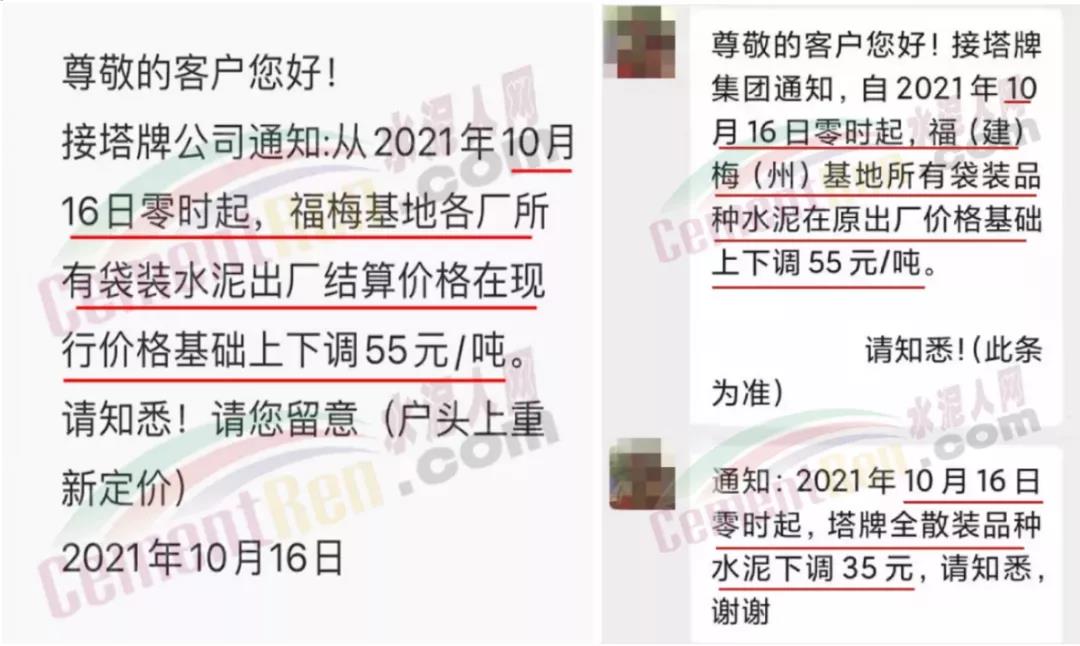 ?水泥人網(wǎng)通訊員消息:10月16日華南區(qū)域主要品牌企業(yè)塔牌水泥、焦嶺龍騰水泥通知下調(diào)水泥價(jià)格35-55元/噸。