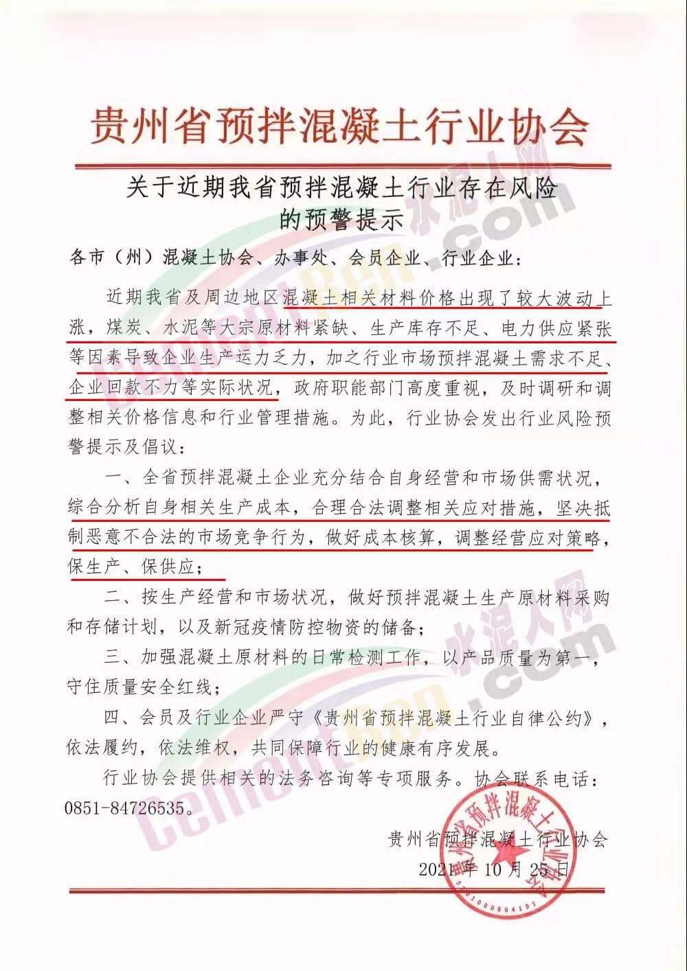 25日,貴州省預(yù)拌混凝土行業(yè)協(xié)會發(fā)布《關(guān)于近期我省預(yù)拌混凝土行業(yè)存在風(fēng)險的預(yù)警提示》稱,近期貴州省及周邊地區(qū)混凝土相關(guān)材料價格出現(xiàn)了較大波動上漲,煤炭、水泥等大宗原材料緊缺、生產(chǎn)庫存不足、電力供應(yīng)緊張等因素導(dǎo)致企業(yè)生產(chǎn)運力乏力,加之行業(yè)市場預(yù)拌混凝土需求不足、企業(yè)回款不力等實際狀況,政府職能部門高度重視,及時調(diào)研和調(diào)整相關(guān)價格信息和行業(yè)管理措施。