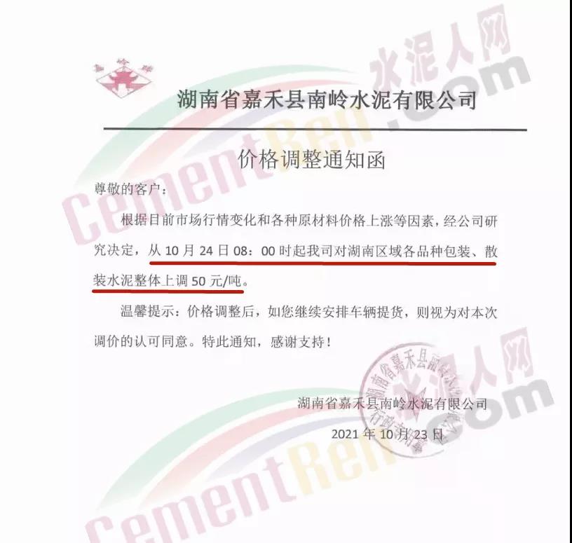 湖南省嘉禾縣南嶺水泥有限公司通知,根據(jù)目前市場行情變化和各種原材料價格上漲等因素,經(jīng)公司研究決定從10月24日8時起,對湖南區(qū)域各品種包裝、散裝水泥整體上調(diào)50元/噸。