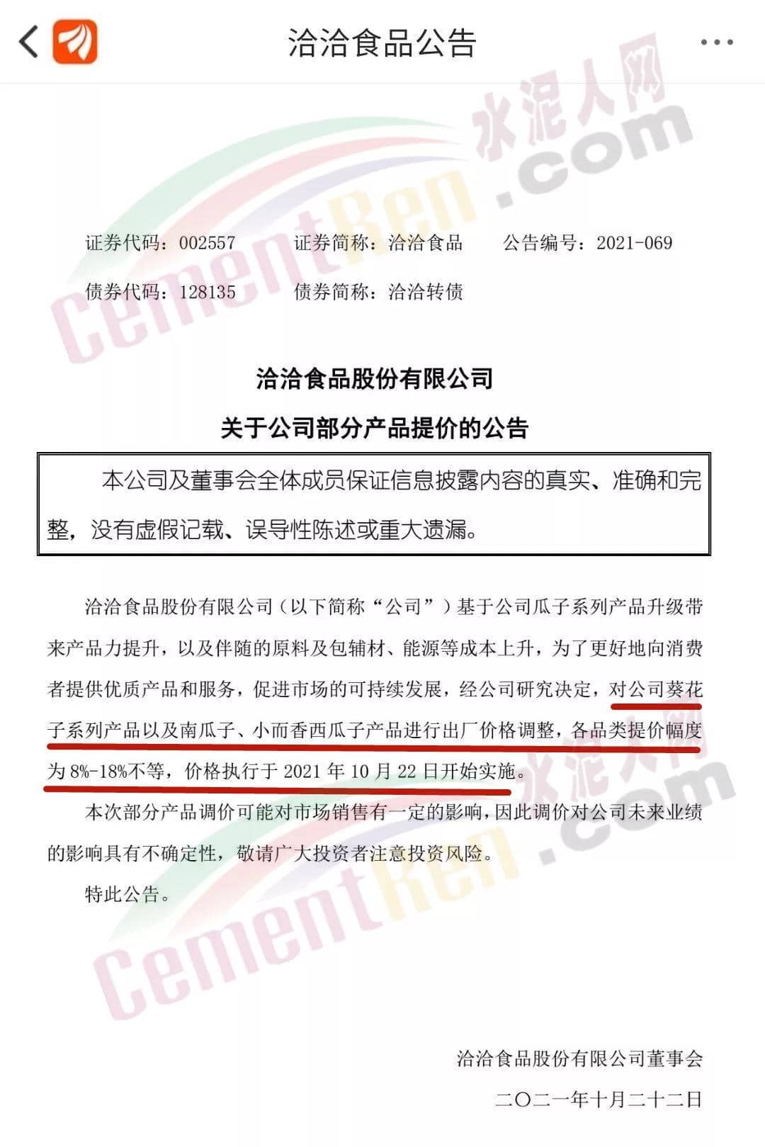 10月22日下午,炒貨龍頭企業(yè)洽洽食品宣布,對(duì)公司葵花子系列產(chǎn)品以及南瓜子、小而香西瓜子產(chǎn)品進(jìn)行出廠價(jià)格調(diào)整,各品類提價(jià)幅度為8%-18%不等,價(jià)格于2021年10月22日開始實(shí)施。