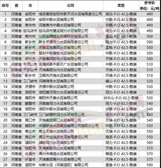 據(jù)水泥人網(wǎng)信息中心人工采購(gòu)數(shù)據(jù),河南區(qū)域目前報(bào)價(jià)在基本穩(wěn)定在490-590元/噸之間。也有極個(gè)別企業(yè)量大優(yōu)惠,在此價(jià)格基礎(chǔ)上下降10-20元/噸。