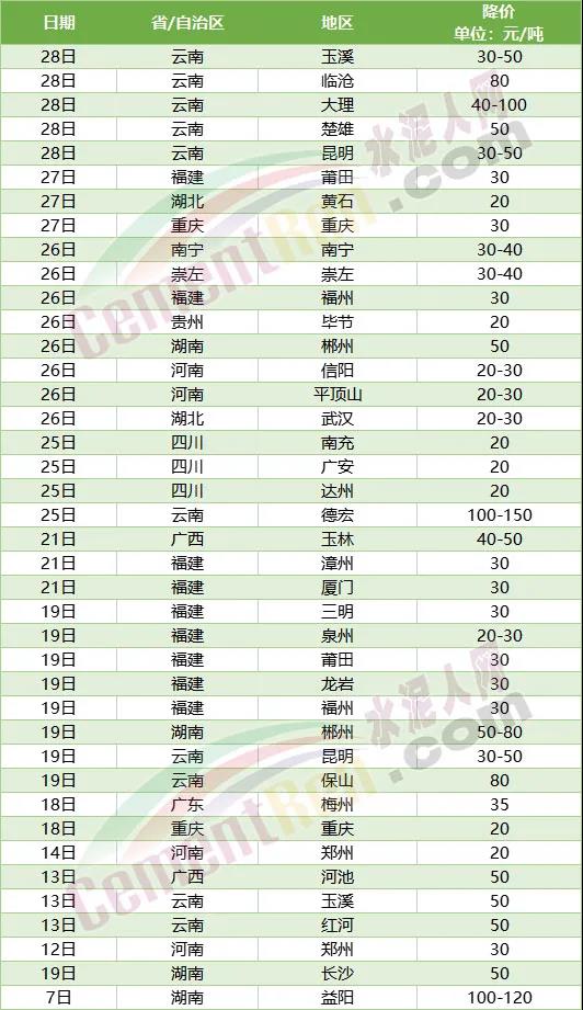 水泥人網(wǎng)信息中心相關(guān)數(shù)據(jù)顯示,本月內(nèi)福建三明、泉州、莆田、龍巖、福州、漳州、廈門;廣東梅州、廣西河池、貴州畢節(jié)、河南鄭州、湖北黃石、湖南益陽、長沙、郴州;四川南充、廣安、達州;云南玉溪、紅河、昆明、大理、保山、德宏以及重慶地區(qū)水泥價格均有不同幅度的下跌。
