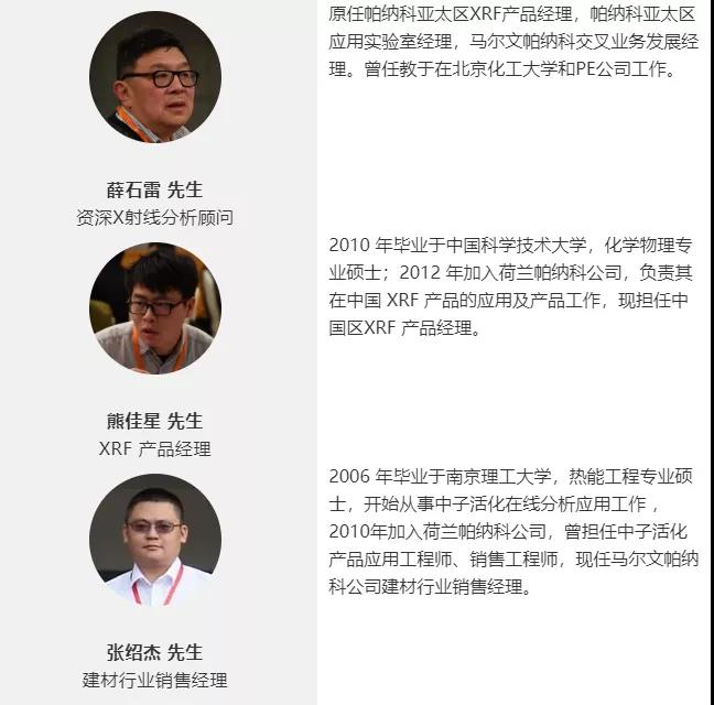 此外,本次研討會(huì)更是邀請(qǐng)到了多為行業(yè)重量級(jí)應(yīng)用專家,其中,資深 X射線分析顧問薛石雷一先生、XRF產(chǎn)品經(jīng)理熊佳星先生、建材行業(yè)銷售經(jīng)理張紹杰先生將在線為您帶來馬爾文帕納科 XRF、XRD、CNA中子活化跨帶分析、在線粒度分析、制樣設(shè)備、智能化實(shí)驗(yàn)室等行業(yè)應(yīng)用分享,針對(duì)性的介紹水泥生產(chǎn)中每一個(gè)環(huán)節(jié)的馬爾文帕納科解決方案;并對(duì)日常儀器的使用和維護(hù)在線答疑。